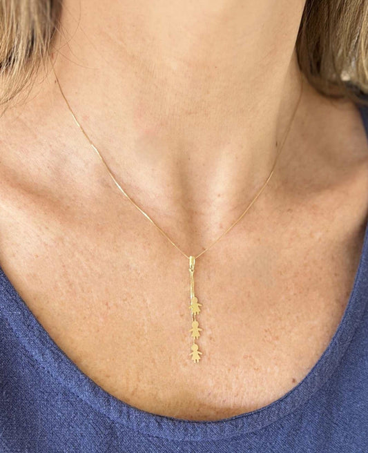 Nessa outra coleção de colares para mães, os bonequinhos ficam pendurados diretamente na corrente, criando um visual leve e atual. O movimento sutil torna a peça ainda mais encantadora. Perfeito para mães de meninos e meninas: